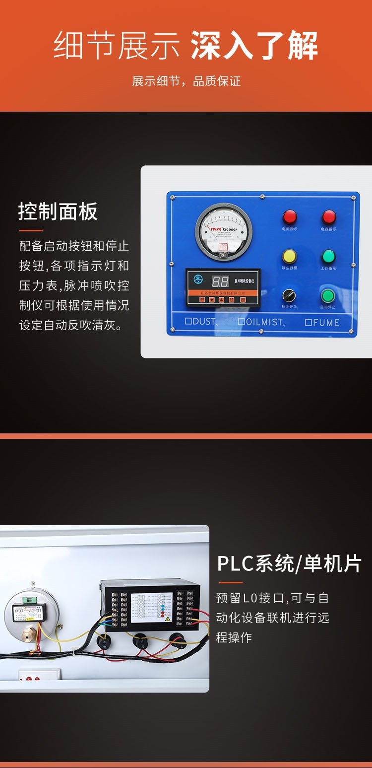 5、MCJC系列脉冲反吹式集尘器全自动脉冲除尘振尘系统,工业集尘脉冲集尘器采用不同的基材制作的滤芯所应对的过滤方案也不一样,可自由设置清尘参数,高度大面积的过滤器过滤度达0.3微米,有效保证了周边工作环境清洁。
